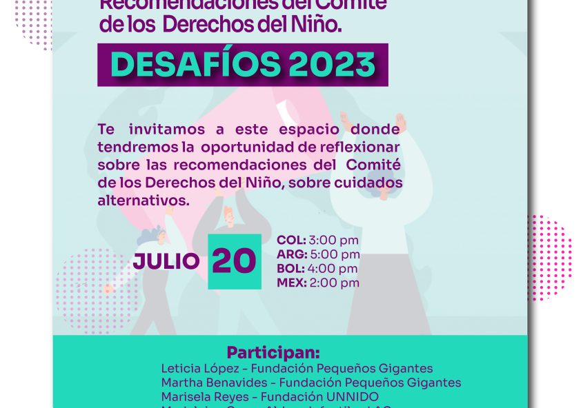 La Red Latinoamericana de Egresadxs de Protección te invita al siguiente webinar: Reflexiones sobre las recomendaciones del Comité de los Derechos del niño sobre los cuidados alternativos. Desafíos 2023 Fecha: 20 de julio de 2023 Hora: 2:00 a 3:30 p.m (Hora Ciudad de México) ¡Te esperamos! INSCRÍBETE AQUÍ -